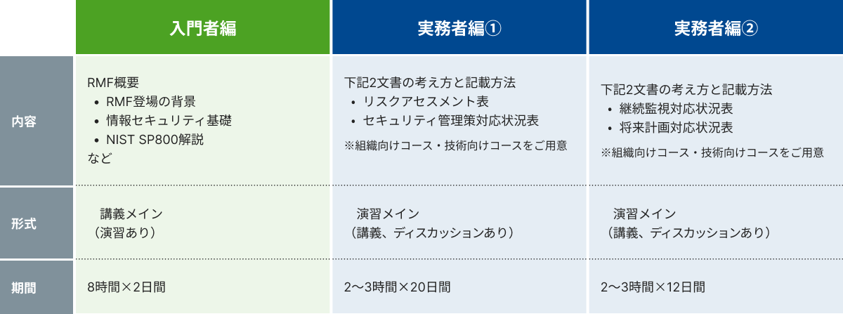 「実務者編」は、従来「技術者編」として提供されていた、RMF対応業務の初動対応で必要となる「セキュリティ計画」および「リスク分析・評価」の対応プロセスに加え、「継続的監視」および「将来計画」の対応プロセスに関する演習や講義を新たに追加し、内容を拡充したプログラムです。これまで防衛装備品製造・納入企業を対象として提供していましたが、RMF対応業務に携わる多様なステークホルダーからのニーズの高まりを受け、この度、防衛装備品や情報システムのオーナー組織を対象とした「組織向けコース」と、防衛装備品や情報システムの製造・開発ベンダーを対象とした「技術向けコース」の2種類のコースの展開を開始しました。
